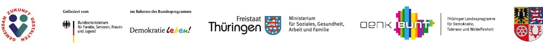 Das Projekt wird unterstützt durch die lokale Partnerschaft für Demokratie, dem Bundesministerium für Bildung, Familien, Senioren, Frauen und Jugend mit ihrem Bundesprogramm „Demokratie leben“ sowie dem Thüringer Ministerium für Soziales, Gesundheit, Arbeit und Familien mit ihrem Landesprogramm für Demokratie, Toleranz und Weltoffenheit „Denk bunt“.